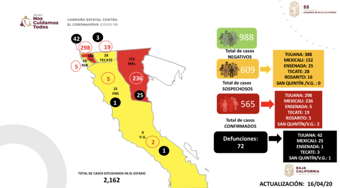 La Secretaria de Salud de BC informó que hasta hoy 17 abril se registran 565 casos positivos de COVID-19 en el Estado, de los cuales son 298 corresponden a Tijuana, 236 a Mexicali, 5 en Ensenada, 19 en Tecate, 5 en Rosarito y 2 más en San Quintín-Vicente Guerrero.