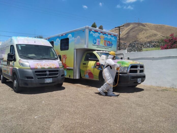 El coordinador del departamento de Vectores, Eduardo Altamirano Aceves, informó que los equipos de moto-mochila con los que cuentan han servido para rociar una solución sanitizante con base en hipoclorito y otras sustancias que ayudan a descontaminar las áreas públicas.
