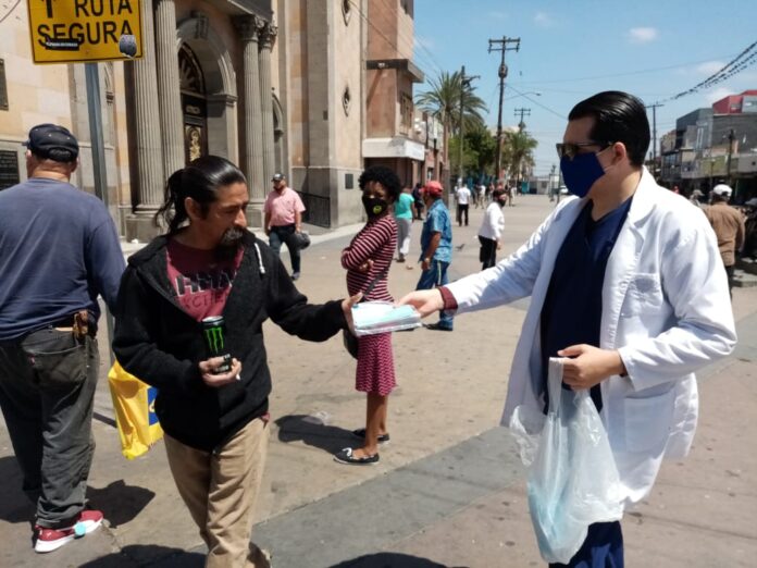 TIJUANA.- Para evitar el contagio de COVID-19, la Secretaría de Salud del Estado realizó la entrega de tres mil 500 cubre-bocas en distintos puntos de las ciudades hermanas de Tijuana, Tecate y Playas de Rosarito, con el apoyo de cerca de 60 trabajadores sanitarios.