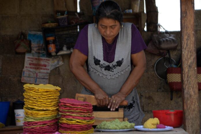 EFE SAN CRISTÓBAL (MÉXICO) Las mujeres de Teopisca, poblado del suroriental estado mexicano de Chiapas, mantienen viva la ancestral gastronomía maya al elaborar tortillas y tostadas de maíz de colores, utilizando como materia prima granos criollos y legumbres de la región.