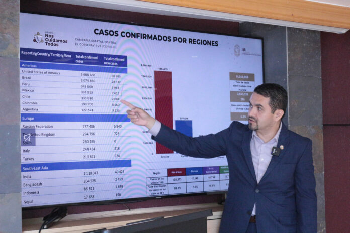 El secretario de Salud, Alonso Pérez Rico, presentó las gráficas en dicha plataforma, las cuales aparecen en color naranja los casos acumulados y en color verde los activos.