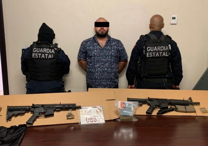TIJUANA.- La Fiscalía General del Estado capturó a un individuo por el presunto delito de portación de armamento de alto poder, ya que circulaba con un vehículo último modelo con insignias apócrifas de la FGE, en el que trasladaba dos rifles de asalto calibre .223 abastecidos, así como una caja con cartuchos.