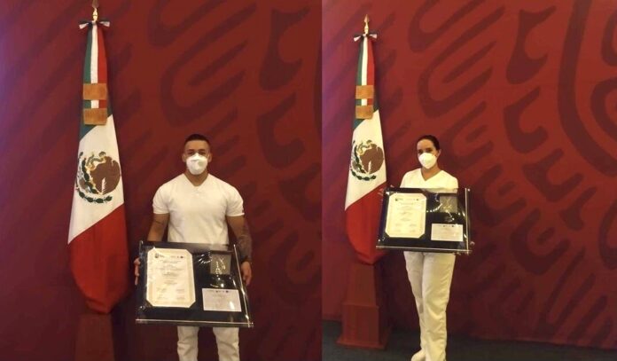 MEXICALI.– Los enfermeros Karla Daniela Ramos Sandoval e Israel Quiroz Guerra, adscritos al Hospital General de Mexicali, fueron parte de los 58 integrantes del personal médico del sector salud en el país, reconocidos con la presea “Miguel Hidalgo”, en Grado Cruz, concedida al personal médico y de enfermería en todos los niveles que ha colaborado directamente en la atención clínica de los pacientes con COVID-19 dentro de los hospitales COVID denominados de alta productividad.