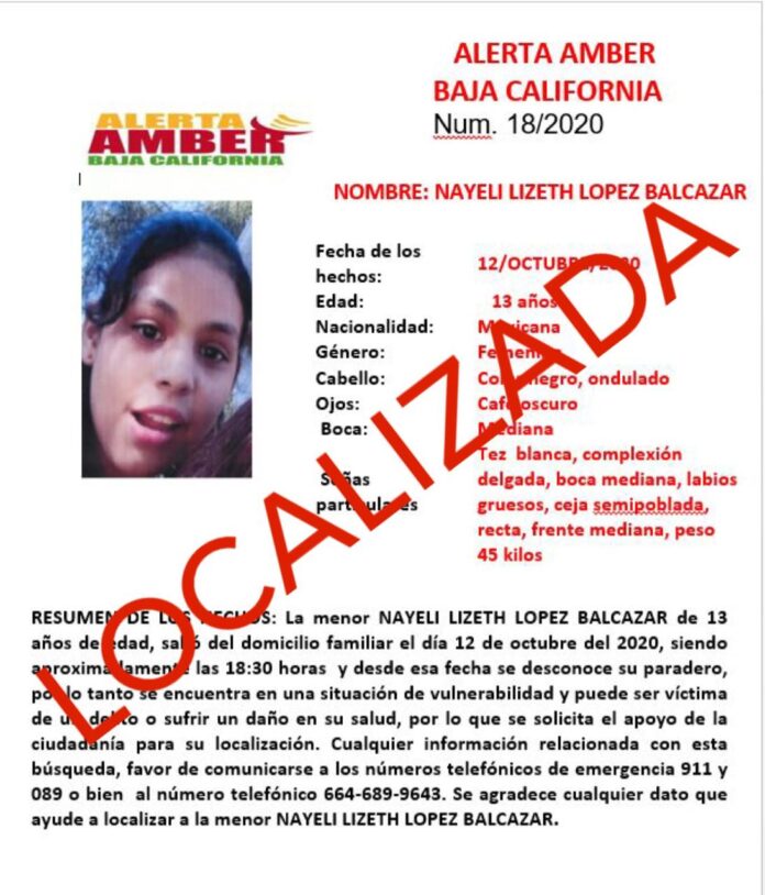 TIJUANA.– La Fiscalía General del Estado (FGE) informa que la menor Nayeli Lizeth López Balcázar de 13 años de edad ya fue localizada, se encuentra sana y salva.