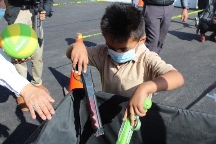 Durante la “Jornada Estatal de Intercambio de Juguete Bélico”, los menores de edad también participaron en dinámicas y juegos implementados por el personal de prevención del delito de la Fiscalía General del Estado (FGE).