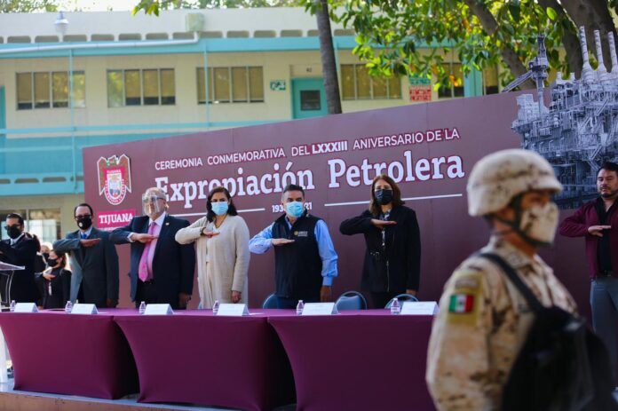 TIJUANA.- La presidenta municipal, Karla Ruiz Macfarland acudió a la ceremonia conmemorativa por el 83 Aniversario de la Expropiación Petrolera, realizada en la explanada Salvador Allende, de la preparatoria federal Lázaro Cárdenas.