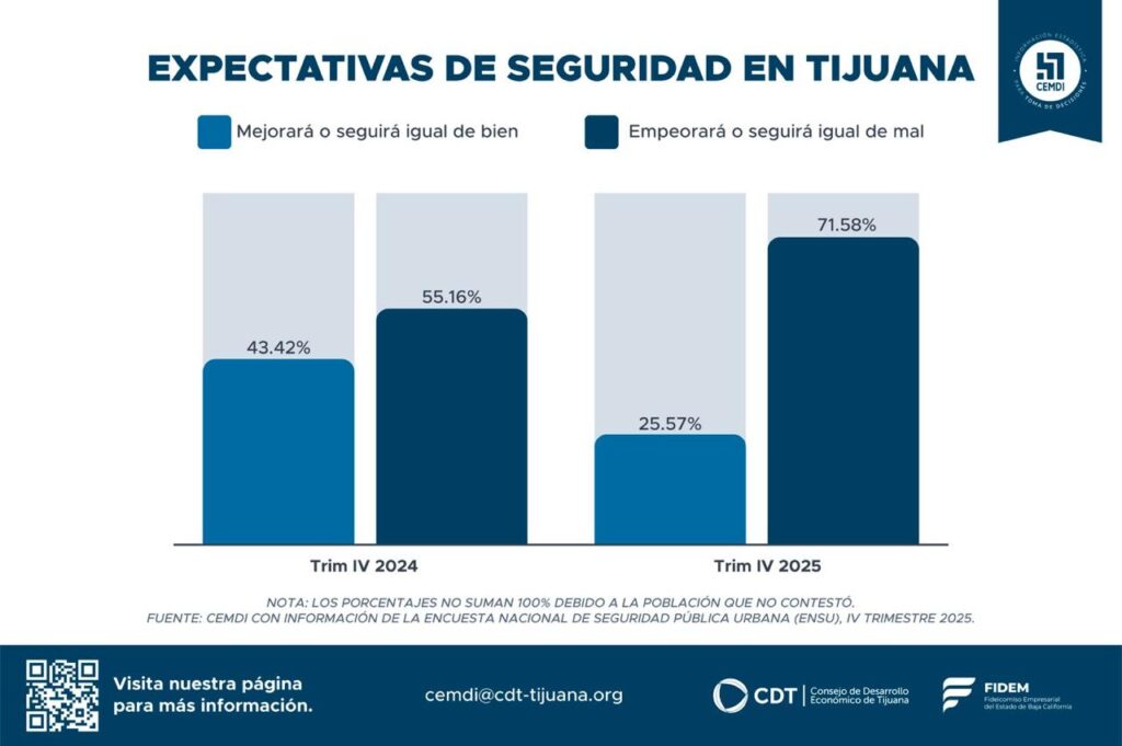 ARTÍCULO LIBRE.- Con la reciente publicación de la Encuesta Nacional de Seguridad Pública Urbana (ENSU), el Centro Metropolitano de Información Económica y Empresarial (CEMDI) elaboró un análisis de los principales resultados en la ciudad de Tijuana al cuarto trimestre del 2025.
