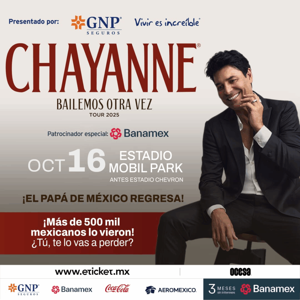 Una de las fechas más esperadas por sus fans mexicanos será en Tijuana, donde Chayanne se presentará el jueves 16 de octubre de 2025 en el Estadio Mobil Park (antes Chevron). El espectáculo promete una noche inolvidable con temas como “Dejaría Todo”, “Salomé”, “Torero”, así como los nuevos sencillos “Bailemos Otra Vez” y “Bailando Bachata”. Esta presentación forma parte de la etapa americana de la gira y será una oportunidad única para el público bajacaliforniano de cantar y bailar junto a uno de los grandes íconos de la música latina.